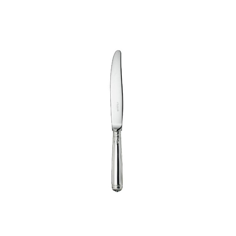 Christofle Malmaison Coltello tavola Il coltello tavola in lega argentata nel modello Malmaison ha una lama in acciaio per resistere meglio all'usura e agli strappi e per aumentare la qualità della fetta. MATERIALE • Lega argentata DIMENSIONI • Lunghezza: 25 cm