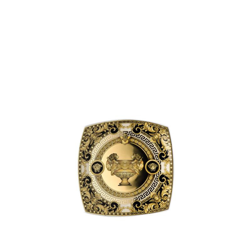 Elementi dorati in stile barocco fanno da cornice ad un vaso di lusso e a due imponenti leoni. La nuova prestigiosa collezione Prestige Gala dona un tocco di eleganza alla tavola con le tonalità del nero e dell'oro e si lascia ispirare dal design iconico della seta di "Le Vase Baroque" di Versace. Dimensioni: cm 14