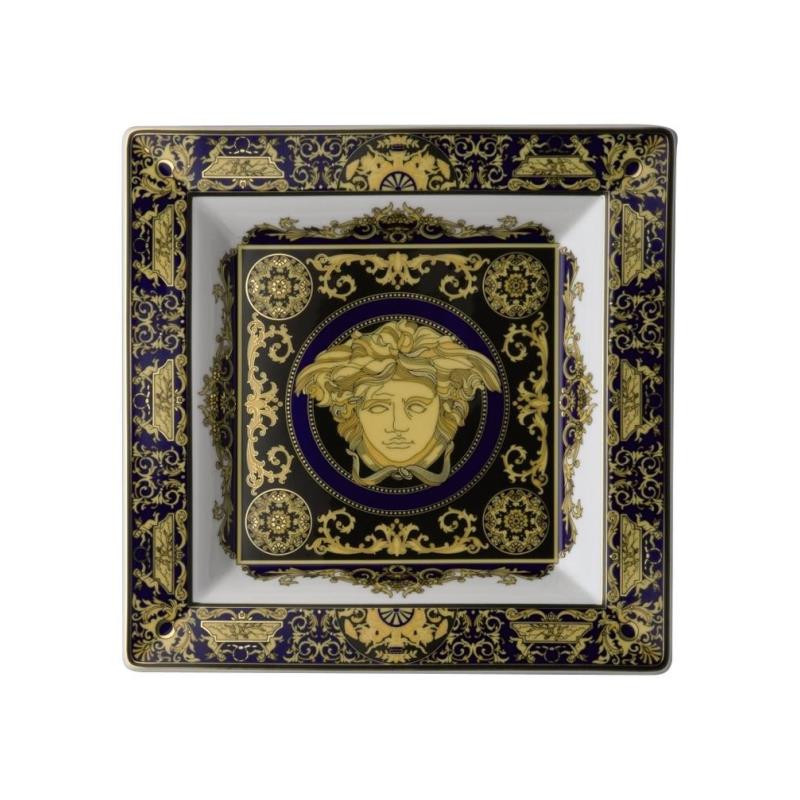 Oggetto prodotto in finissima porcellana dal decoro lussuoso dove prevale il colore blu che caratterizza questo motivo Medusa. I fregi oro conferiscono all'oggetto uno stile particolarmente ricco e sontuoso. Dimensioni: 22x22 cm