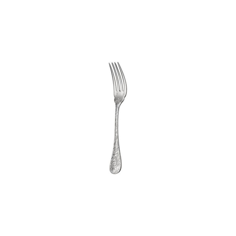 Christofle Jardin D'Eden forchetta dolce La forchetta dolce in lega argentata nel modello Jardin D'Eden ha un bordo largo progettato appositamente per il taglio di torta e torta sul piatto. L'intricato modello verdeggiante del designer Marcel Wanders è caratterizzato da intrecci di viti, piante e fiori e prende il nome dal giardino più famoso della storia. MATERIALE • Lega argentata DIMENSIONI •: 16 cm