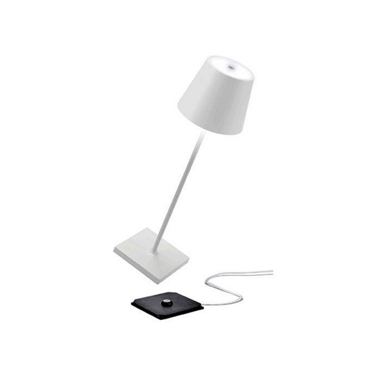 Poldina Pro è una lampada da tavolo portatile e ricaricabile, ideale per ambienti interni ed esterni. Dotata di un controllo touch sulla testa per accensione, regolazione dell'intensità luminosa e selezione della temperatura colore (2700K-3000K). Realizzata in alluminio pressofuso con diffusore in policarbonato, è resistente e pratica, grazie alla base di ricarica a contatto inclusa.