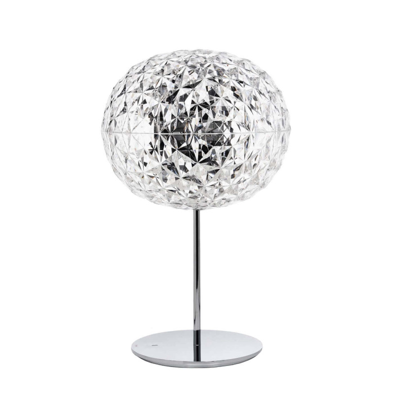 LAMPADA DA TAVOLO PLANET, 9385 - KARTELL La Kartell Planet è una serie completa di lampade che comprende sospensioni, lampade da tavolo basse e modelli con struttura in metallo. La caratteristica distintiva di queste lampade è la forma del diffusore, leggermente ovoidale, trasparente e con una superficie sfaccettata sia all'interno che all'esterno, creando un suggestivo gioco di riflessi luminosi. Materiale Struttura: Tecnopolimero termoplastico trasparente o colorato in massa Dimensioni Altezza: 53 cm Diametro: 33 cm Peso unitario: 3,14 kg