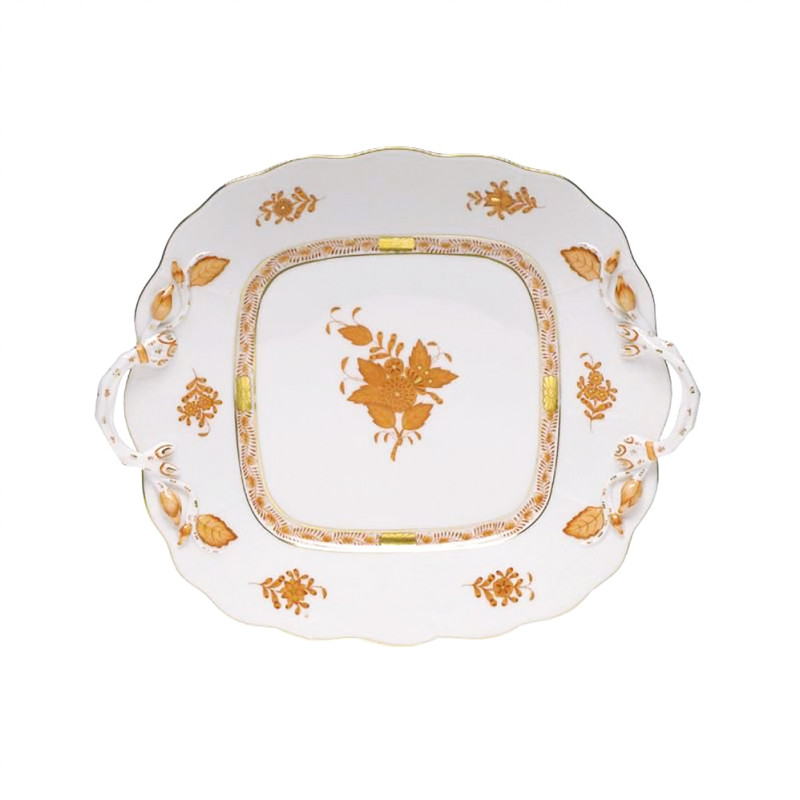 PIATTO TORTA QUADRATO 28 X 24,5 CM, APPONYI ORANGE AOG 1430 - HEREND Il decoro, noto anche come Chinese Bouquet, è stato creato per il Conte Albert Apponyi, un famoso politico e diplomatico ungherese della fine dell'800. Il disegno raffigura un cesto di fiori indiani stilizzati dipinti rigorosamente a mano libera dai maestri pittori di Herend. Piatto torta quadrato 28 x 24,5 cm Materiale: porcellana con decorazioni in oro Codice: 1430 Si consiglia il lavaggio a mano. Mai mettere nel microonde un articolo con finiture oro o platino.