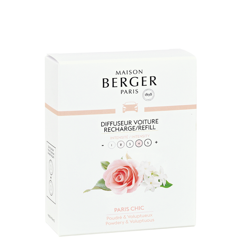 Il set di 2 ricariche per diffusore auto "Paris Chic" di Maison Berger è ideale per profumare il tuo veicolo con una fragranza elegante e sofisticata. Note floreali e fresche trasportano in un viaggio olfattivo che ricorda il fascino intramontabile della capitale francese, regalando un’esperienza di guida raffinata e piacevole.