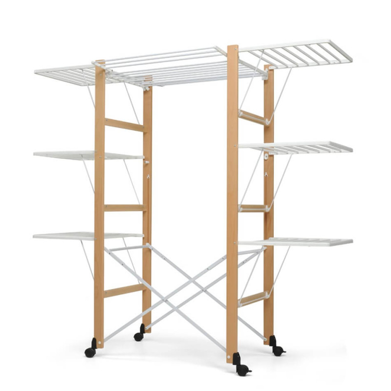 Ursus offre ben 33 metri di filo utile per stendere il bucato, ma quando è chiuso sta in piedi da solo e occupa solo 18 centimetri di spazio. È dotato di 4 ruote piroettanti (due con freno) per un facile spostamento, anche con il bucato steso. La struttura in legno massiccio di faggio verniciato è robusta e disponibile in due colori: naturale e noce.