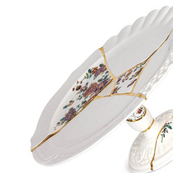 The Japanese art of Kintsugi takes on contemporary forms. Delicate porcelain enriched with gold fragments creates a unique elegance, transforming every piece in the collection into a fascinating and unexpected composition.