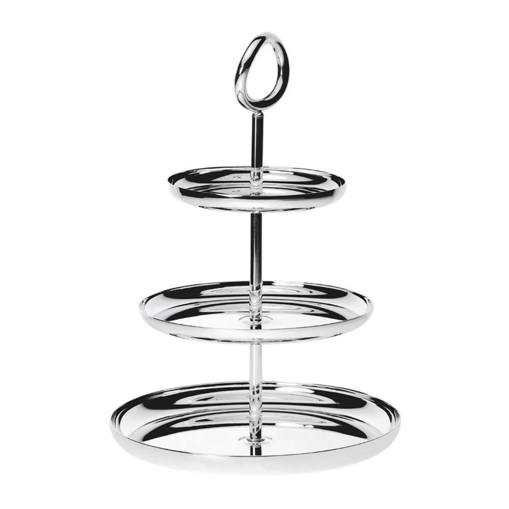 Christofle Vertigo Silver Plated Three-Tier Dessert Stand The silver plated Vertigo three-tier dessert stand adds modern and playful elegance to your table or dessert buffet. Perfect for serving cupcakes, breakfast pastries, mini desserts or small sandwiches at tea time. Vertigo’s bold motif — a subtly asymmetrical, thick ring often placed playfully askew — can be found on every piece in the collection designed by Andrée Putman. Vertigo features a strong emblem: a Ring, whose sensual & subtly asymmetric design is found on every Piece. MATERIAL • Silver Plated DIMENSIONS • Height: 27 cm