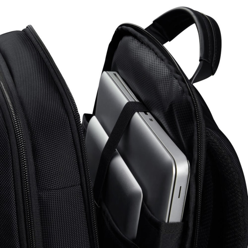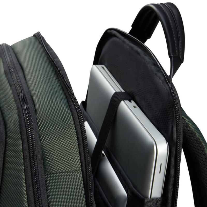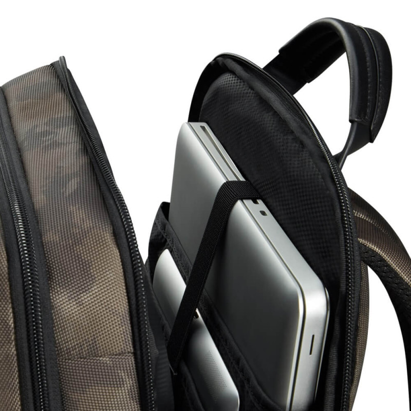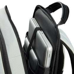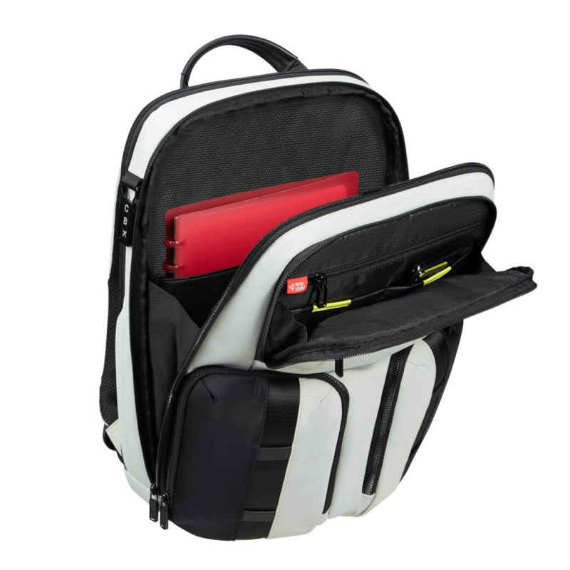 Water-resistant Model: Backpack The outer and inner fabric are made with 37 recycled PET bottles (0.5l-20g). Zippers: Yes Handles: Top handle(s) External pockets: 4 front pockets Smart Sleeve: Yes Straps: Ergonomic shoulder straps Sternum Strap: Yes Bottle holder: Yes Exterior: The outer fabric is made of recycled ballistic nylon. The lining and support are made of virgin materials. Interior: The inner lining is made of 100% post-consumer recycled PET, part of our Recyclex™ Material Technology Initiative. The exterior and back panel are made of virgin materials. Recycled PET bottles