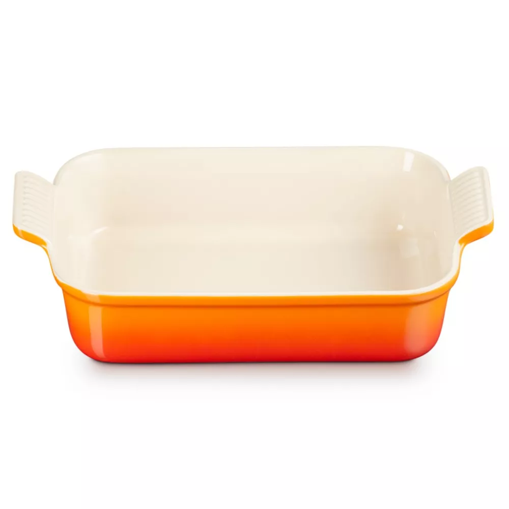 RECTANGULAR HERITAGE STONEWARE BAKING DISH - LE CREUSET This heritage stoneware dish is a kitchen essential. Its rectangular shape fits all sorts of ingredients, making it a very versatile piece for your everyday roasting, baking, marinating and serving. Easy-grip scalloped handles mean it’s safe and effortless to move around, while deep side walls bring you plenty of cooking space. Exceptional durability: resists blows and stains. Non-porous enamel surface: it does not absorb odors or flavors. Ease of cleaning. Compatible with oven, microwave, freezer and dishwasher. Highly resistant ceramic: from -23ºC to 260ºC. It keeps both heat and cold.