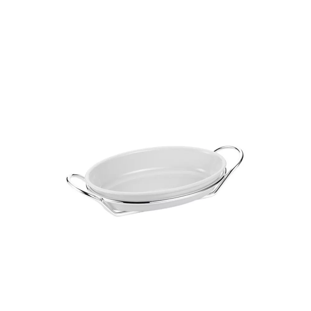 White porcelain oval oven dish with silver-plated holder - Dimensions: 36 cm Item BHL0009