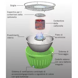 The LotusGrill is an innovative portable barbecue with a battery-powered fan that speeds up charcoal ignition, making it ready to use in just 3-4 minutes. With a closed charcoal container and double-wall construction, it is safe, easy to handle and can be moved even while in use. Its clever design collects grease in the inner bowl, preventing flames and smoke. Supplied with a practical nylon carrying bag, it is a versatile and safe solution, the perfect gift for outdoor grilling enthusiasts.