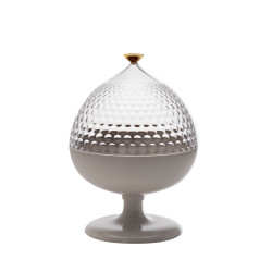 PUMO STORAGE CONTAINER, 1551 - KARTELL Pumo is a versatile container that draws inspiration from the shapes of a traditional Puglian object, which symbolizes good luck. Kartell has reinterpreted it with a multifaceted lid, making it perfect as a centerpiece. This object is not only ideal for storage and organization, but it can also be used as a centerpiece, adding a decorative and evocative touch to the environment. Structure material: Transparent And/Or Mass-Coloured Thermoplastic Technopolymer Fireproof: Not Fireproof Usage: Indoor Dimensions: H 29 cm, Ø 21 cm