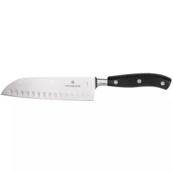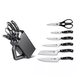 Exceptional quality and timeless elegance are the exclusive features of the Grand Maître series of forged knives by Victorinox. For this reason, each piece seamlessly transitions from the blade to the handle, with only a slight thickening of the steel acting as a separation joint where the two materials meet. Additionally, the joint prevents the hand from slipping from the handle to the blade. As part of this series, the five knives in the Grand Maître knife block share the same basic qualities. This set includes a kitchen knife, a steak knife, a carving knife, a Santoku knife, a chef's knife, and also multi-purpose kitchen shears. The result is a knife block capable of handling practically everything except the most specialized kitchen tasks. Content: Grand Maître small kitchen knife, 8 cm, black Grand Maître steak knife, 12 cm, black Grand Maître kitchen knife, 15 cm, black Grand Maître Santoku knife, hollow edge, 17 cm, black Grand Maître chef's knife, 20 cm, black Multi-purpose kitchen shears, black