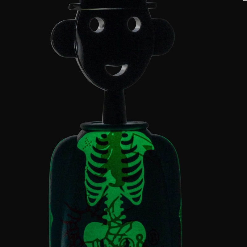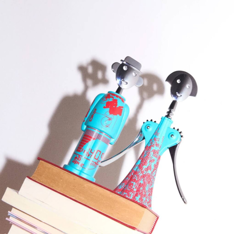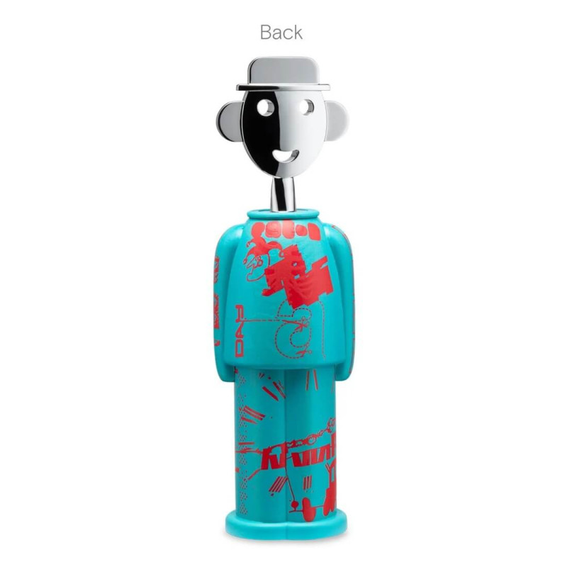 The Alessandro M. Liquid corkscrew, reimagined by the creative trio Studio Temp, offers a contemporary twist on Alessandro Mendini’s iconic design, inspired by street art. The unique graphics draw from eclectic influences, ranging from road signage to modern data protection techniques, creating a cryptic and captivating aesthetic. The phosphorescent elements in the design become visible in the dark, adding an unexpected touch. Made from AlkiPaper®, a bio-composite based on paper and natural materials, this corkscrew is a distinctive and sustainable piece for any table setting.