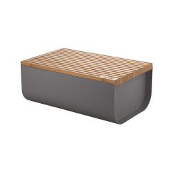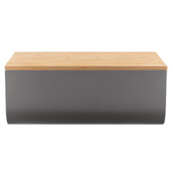 BREAD BIN, MATTINA BG03 - ALESSI The Big-Game design studio proposes a multi-purpose object designed to accompany a daily gesture, the consumption of bread, enhancing its ritual and convivial nature. Mattina is more than just a bread box, it is a container with a lid that is a practical chopping board designed for slicing bread in the best way possible without spreading crumbs across the table. It is a versatile object that can also be used to serve breakfast. Bread box in steel coloured epoxy resin with cutting board with bamboo-wood. Height: 14 cm Lenght: 34 cm Width: 21 cm