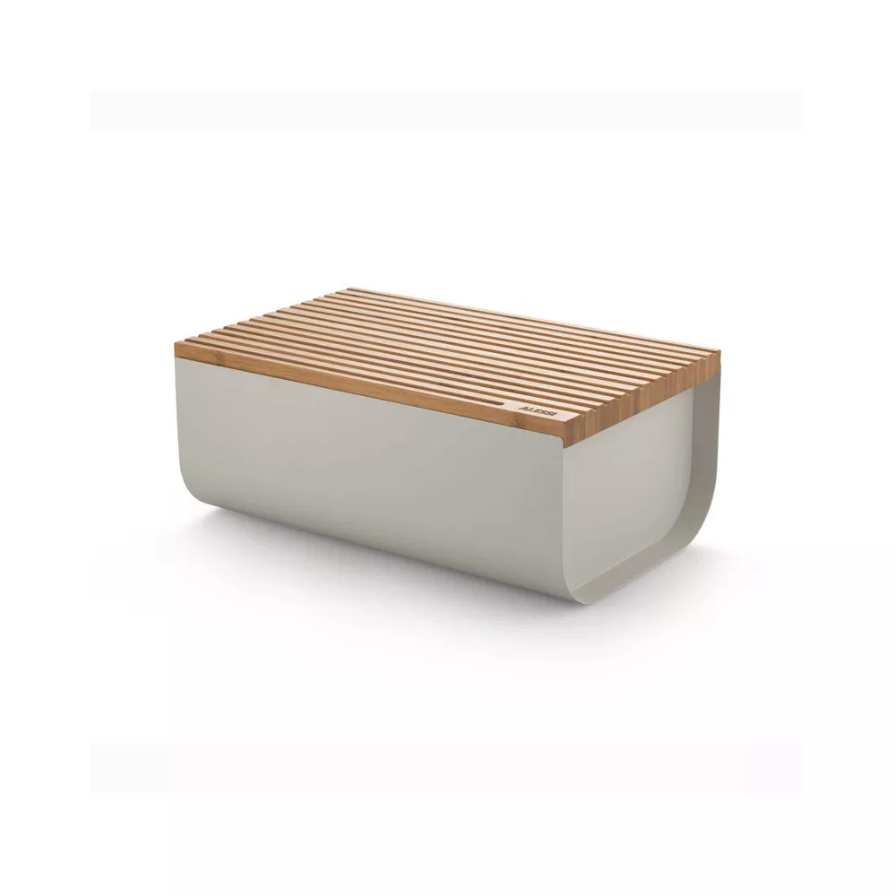 BREAD BIN, MATTINA BG03 - ALESSI The Big-Game design studio proposes a multi-purpose object designed to accompany a daily gesture, the consumption of bread, enhancing its ritual and convivial nature. Mattina is more than just a bread box, it is a container with a lid that is a practical chopping board designed for slicing bread in the best way possible without spreading crumbs across the table. It is a versatile object that can also be used to serve breakfast. Bread box in steel coloured epoxy resin with cutting board with bamboo-wood. Height: 14 cm Lenght: 34 cm Width: 21 cm