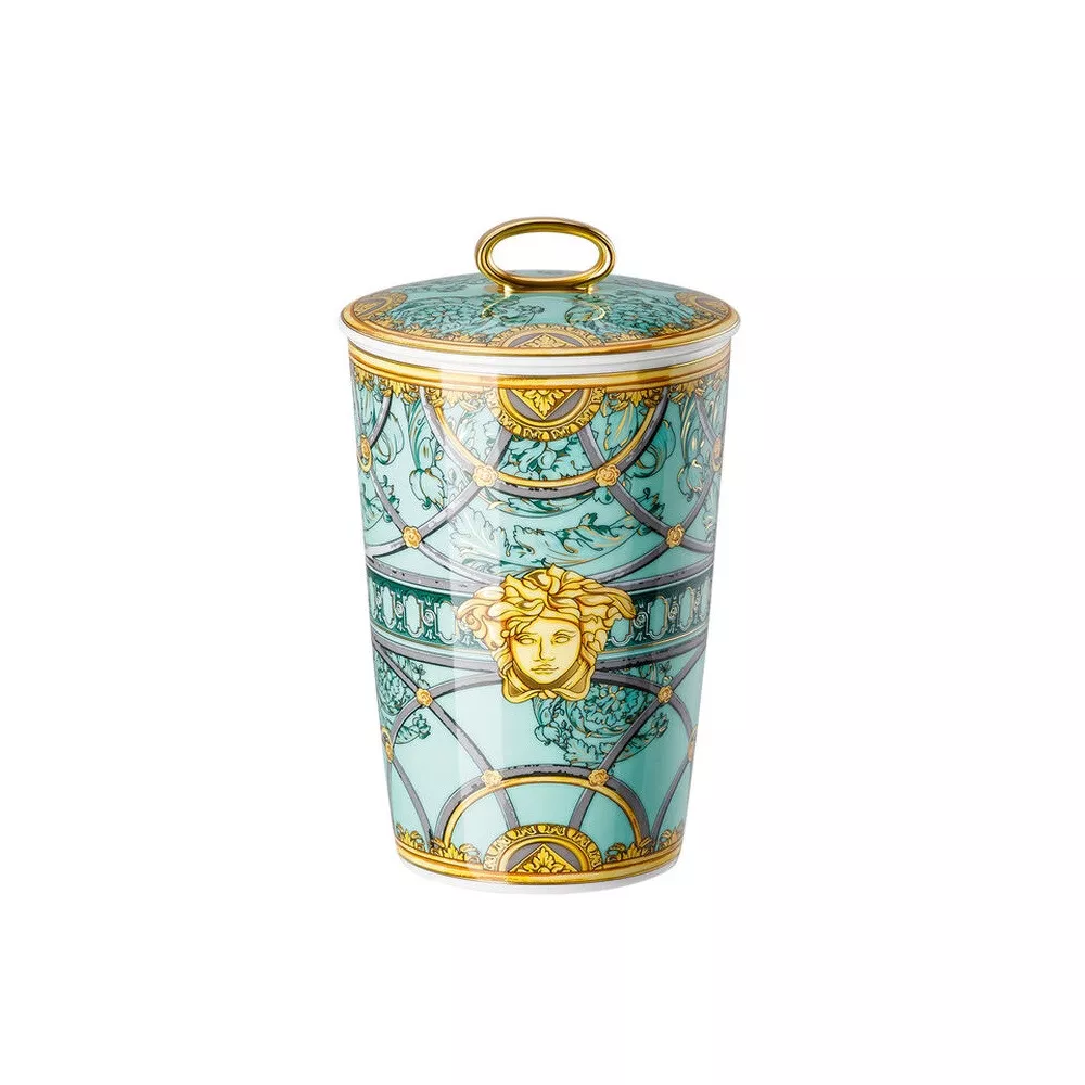 An embodiment of luxury and refinement, the Scala Palazzo Verde scented candle by Versace Home pays homage to the grandeur of the Versace Milanese palace on Via Gesù. The high-quality porcelain candle holder features the La Scala del Palazzo motif, inspired by the majestic marble staircase leading to the private apartments—symbolizing intimacy and elegance.