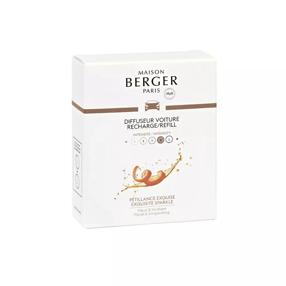 The Exquisite Sparkle fragrance begins with the joyful citrus notes of grapefruit. The sweet and floral heart of patchouli then develops. Elegance and exaltation take over with the gushing scents of a sparkling amber wine. The diffusion time of a ceramic refill is around 4 weeks.