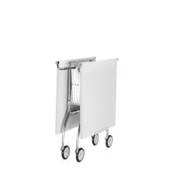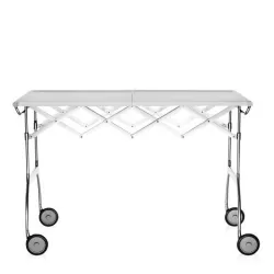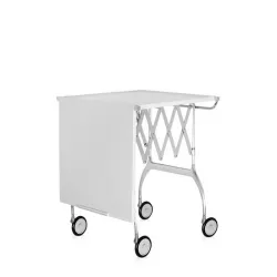 Kartell Battista Trolley white by Antonio Citterio con Oliver Löw Besides being a practical trolley with a striking combination of plastic and metal components, Battista is an all-out extendible and folding table, ideal for buffets and aperitifs or as a small single table. It is available in most colours: white, black, blue, plum or cream and in the elegant polyester version of gloss lacquered white. Material Structure: Acciaio cromato Top: Matt painted or polyester lacquered polyurethane Dimensions Width: 100 cm Depth: 54 cm Height: 69 cm Unit weight: 9.8 kg