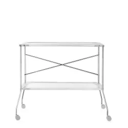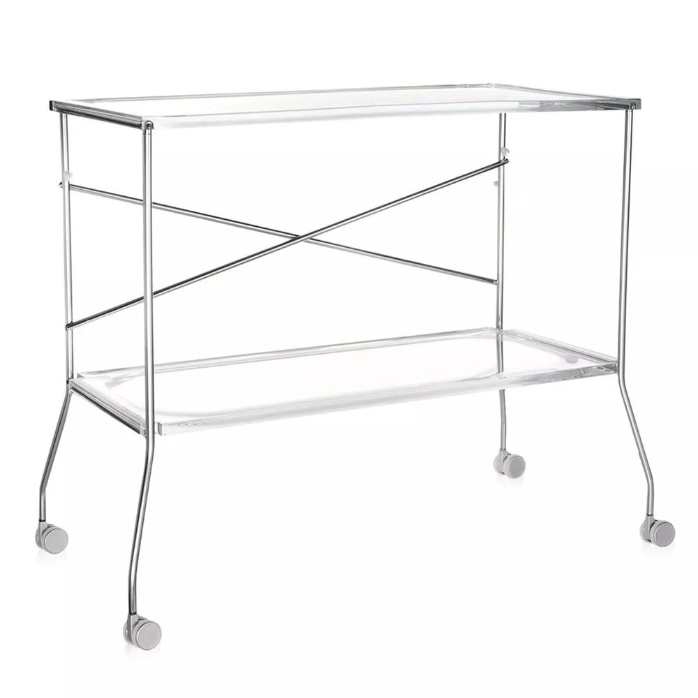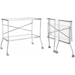 Flip can be used as a trolley, ideal for aperitifs and buffets, but also as a practical table in front of the sofa; folds up and, once closed, takes up minimal space and can be stored very easily. Materials and construction Floors: PMMA Structure: chromed steel Measurements width: 80 cm height: 72 cm depth: 42 (open) 10 (closed) cm 100% Made in Italy Design: Antonio Citterio