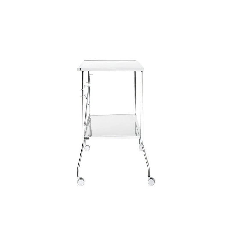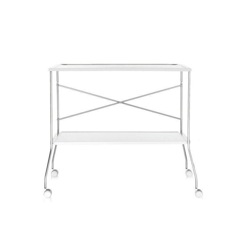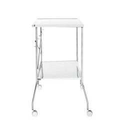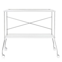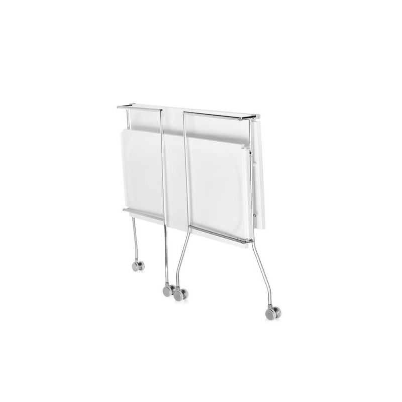 Kartell Trolley Flip white by Antonio Citterio with Toan Nguyen Kartell brings transparency also in the world of carts: Flip is born, a folding trolley that combines the transparent plastic material of the floors with the metal of the structure. The independent surfaces are in polymethylmethacrylate, with a lenticular shape, an extreme synthesis of functionality and aesthetic research. Flip can be used as a trolley, ideal for aperitifs and buffets, but also as a practical sofa-side table; it folds and, once closed, takes up minimal space and can be stored very easily. Material Structure: Chromed steel Floor: PMMA dimensions Width: 80 cm Depth: 42 cm Height: 72 cm Unit weight: 10.4 kg