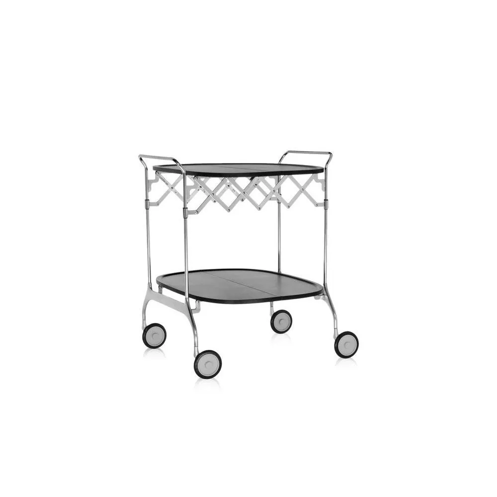 FOLDABLE CART, GASTONE - KARTELL Gastone is a sophisticated and practical folding trolley, featuring a painted plastic tabletop and a chrome-plated steel frame. It is available in five colors: white, black, blue, plum, and cream. The wheels serve as a distinctive element, adding to its aesthetic appeal while ensuring easy mobility. When folded, it has a depth of 23 cm, allowing for convenient and effortless storage. sku: 04473 Structure: Chromed steel Top: Nylon loaded with glass fiber and scratch-resistant painted dimensions Width: 68 cm Depth: 62 cm Height: 70 cm Unit weight: 10 kg