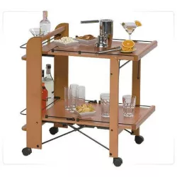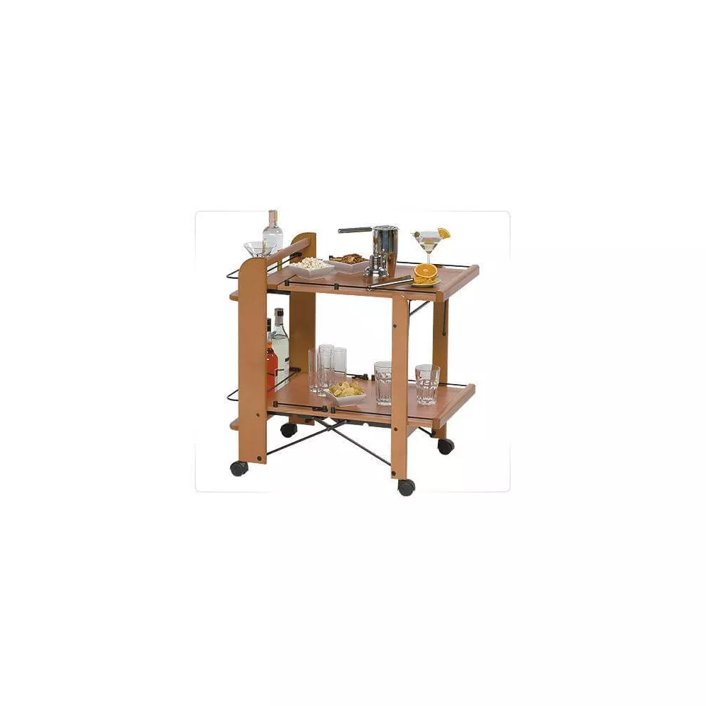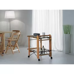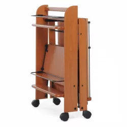 FOOD SERVICE TROLLEY, 2 LEVELS - FOPPPA PEDRETTI This trolley features two spacious food trays with convenient side panels. When closed, it stands upright, keeping glasses and bottles securely in their compartments. The structure is made of solid wood and equipped with swivel wheels. Dimensions WxHxD: Open: 75 x 76 x 49 cm Closed: 27 x 76 x 49 cm