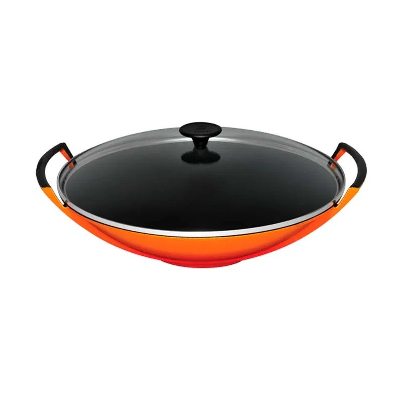 Elegant and versatile, this enameled cast iron wok is perfect for preparing delicious Asian dishes and recipes from around the world. The glass lid allows you to monitor cooking without interruption, preserving flavors and moisture.