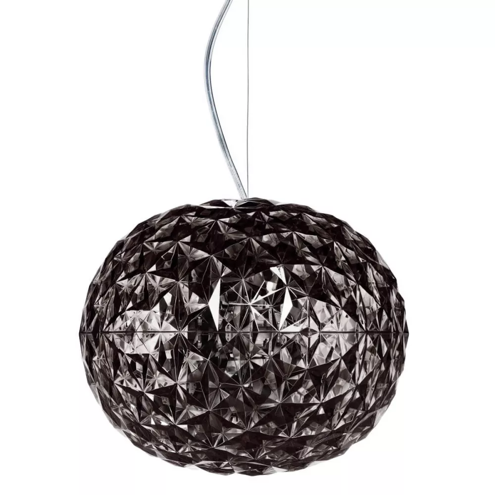 PLANET SUSPENSION LAMP, FUMÈ, 9390/FU - KARTELL Design: Tokujin Yoshioka The Planet series of lamps by Kartell includes suspended and low-height table lamps with a metal structure, all designed by the renowned Tokujin Yoshioka. The transparent diffuser of the lamps is slightly oval and characterized by a faceted surface both on the inside and outside, creating a beautiful reflection effect. The structure is made of transparent or mass-colored thermoplastic polymer. Material: Structure: Transparent or mass-colored thermoplastic polymer Dimensions Height: 27 cm Diameter: 33 cm Unit weight: 2.4 kg