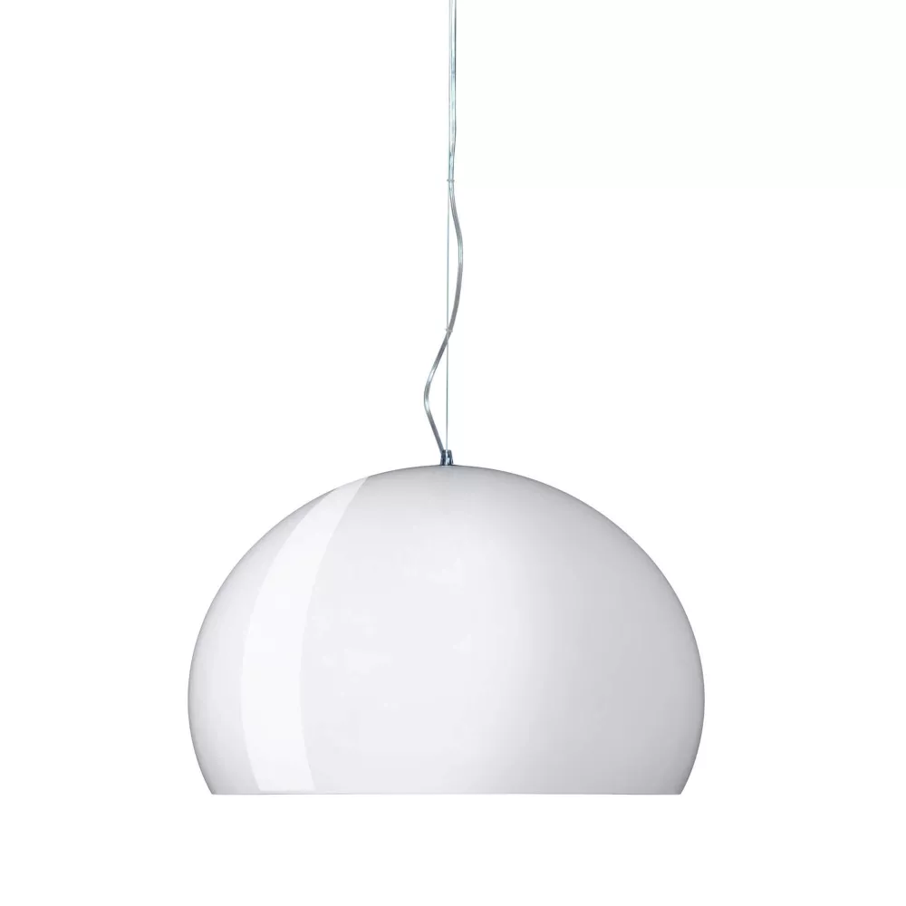 SUSPENSION LAMP, FL_Y 9030 - KARTELL FL/Y is a pendant lamp with essential lines. The transparency of the material and the glossy colors evoke the image of a soap bubble, shimmering with the reflections of light. Additionally, the dome is not perfectly semispherical, as the intersecting plane is below the height of the diameter, allowing for a greater concentration of light. Structure material: Transparent Or Mass-Coloured Pmma Fireproof: Not Fireproof Usage: Indoor Height: 33 cm Diameter: 52 cm