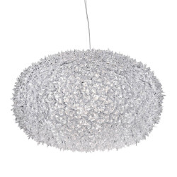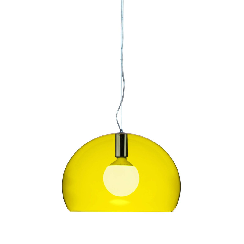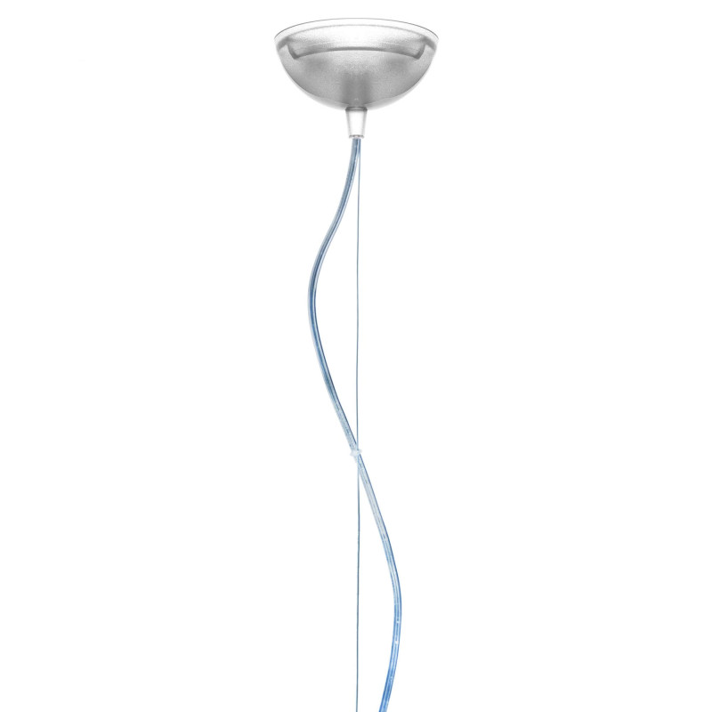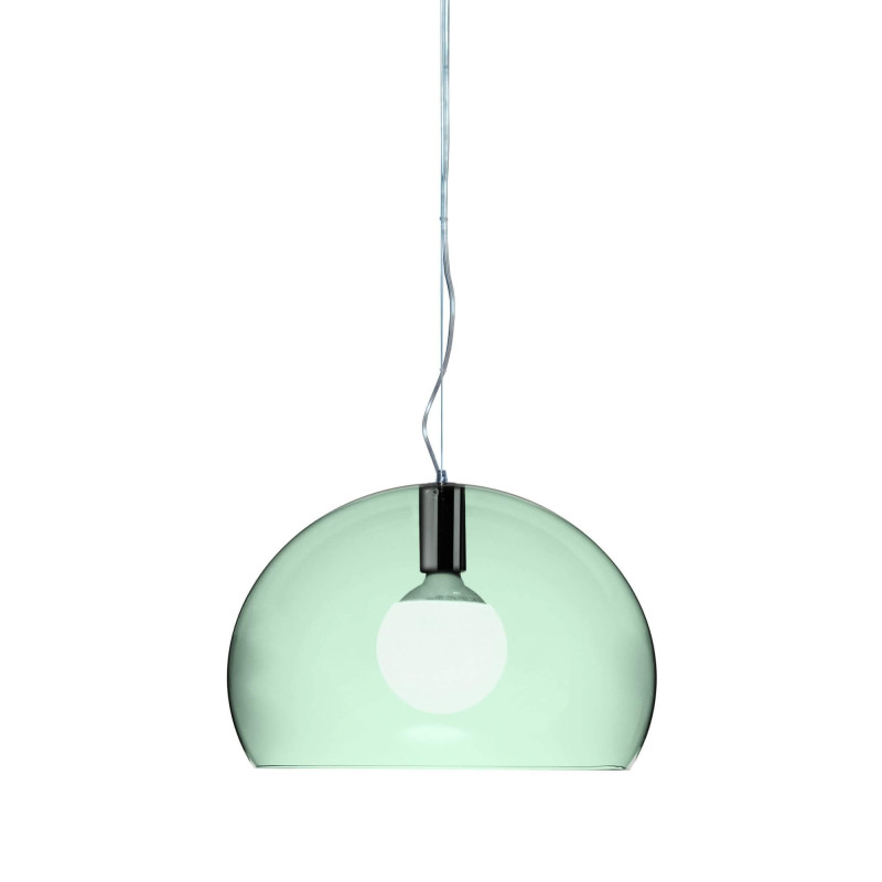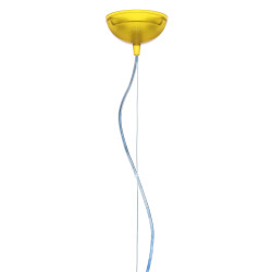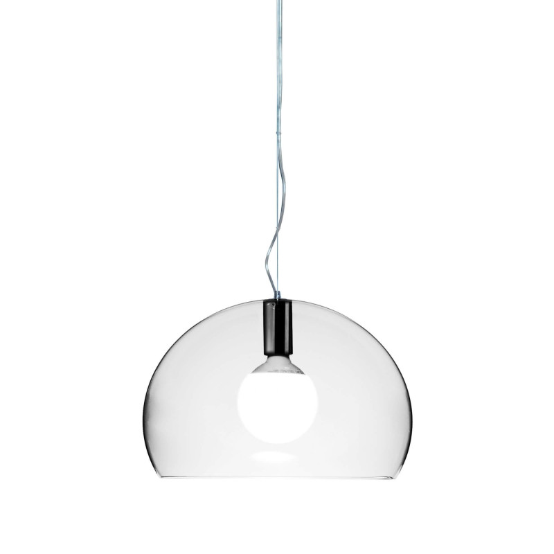 SMALL FL_Y, PENDANT LAMP 9053 - KARTELL FL/Y is a pendant lamp with a minimalist design. Its transparent or mass-colored structure evokes the image of a soap bubble that reflects light in a shimmering way. Unlike traditional semi-spherical lamps, the top part of FL/Y features a secant plane positioned below the height of the diameter, allowing it to gather a greater amount of light. The lamp is made of PMMA, a transparent or mass-colored material, which gives the lamp a particular transparency and shine. However, it is important to note that FL/Y is not fireproof, so it is suitable exclusively for indoor use, in environments where fire resistance is not a fundamental requirement. It can be used as a pendant lamp in various settings such as living rooms, dining rooms, bedrooms, or commercial spaces, adding a touch of design and bright light to the interior. Designer: Ferruccio Laviani Dimensions: 38 × 38 × 28 cm