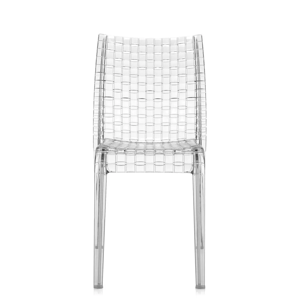 Inspired by the way pattern and texture interweave in a fabric, the Ami Ami chair (its name in Japanese literally means "to weave"), was born of designer's wish to reproduce one of the stylistic icons typical of his country - weaving. Structure material: Transparent Or Mass-Coloured Polycarbonate Fireproof: Not Fireproof Usage: Outdoor Height: 85 cm Width: 43 cm Depth: 51 cm Seating height: 46 cm