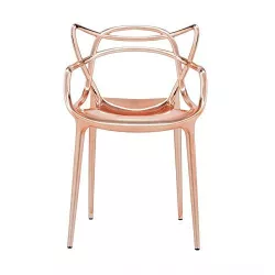 MASTERS CHAIR METALLIC VERSION, 5864 - KARTELL The Masters chair is a sharp tribute to three iconic chairs, reimagined and reinterpreted by the creative genius of Starck. A particular finish gives the chair a sensually velvety appearance. The true distinguishing feature of the chair is undoubtedly its backrest, characterized by the intersecting curves of the three different backrests that merge with the edge of the seat, creating a contrast between voids and solids. The chair is lightweight, practical, and available in a wide range of colors. Structure material: Mass-Coloured Modified Polypropylene Fireproof: Not Fireproof Usage: Indoor Height: 83 cm Width: 53,5 cm Depth: 55 cm Seating height: 46 cm