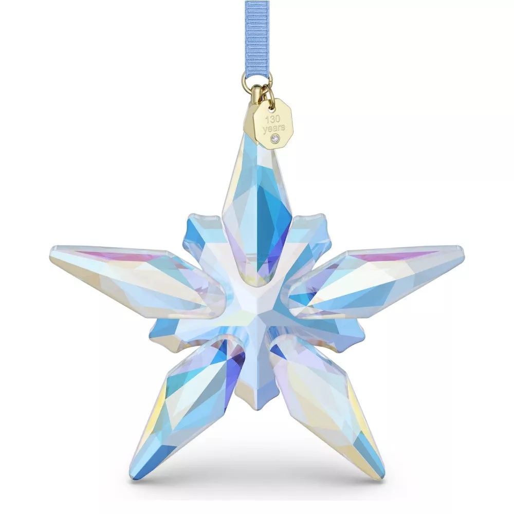A radiant tribute to 130 years of Swarovski craftsmanship: this star-shaped ornament sparkles with 190 facets and the iconic Aurora Boreale effect. Suspended from a light blue grosgrain ribbon, it blends delicate artistry with refined design. The champagne gold-tone metal tag engraved with “130 years” and set with a single chaton adds a celebratory touch. The perfect gift to bring brilliance and meaning to the festive season.