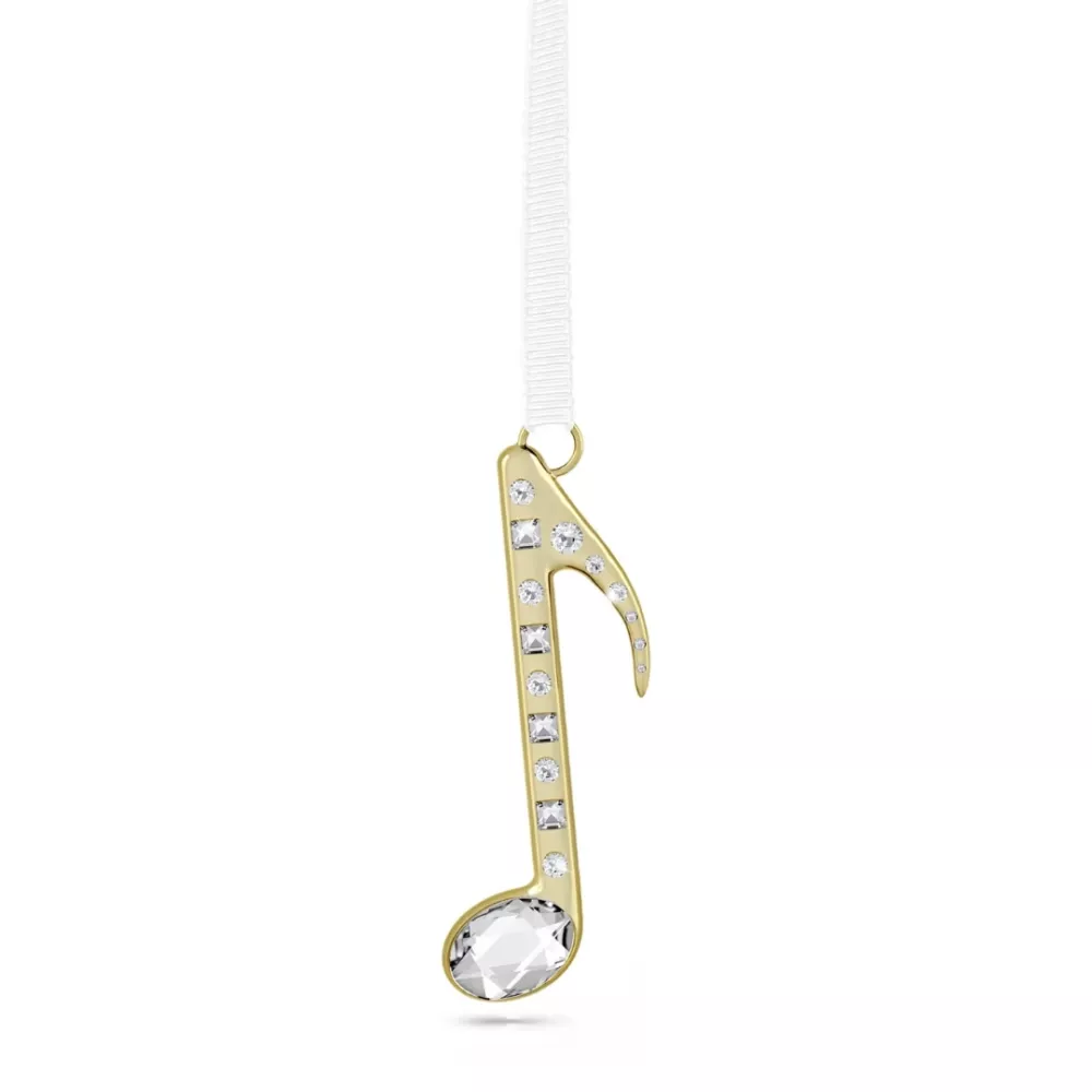 Bring festive harmony to your décor with the Holiday Magic Musical Note Ornament. Crafted in metal with a polished champagne gold-tone finish and adorned with Swarovski crystals on both sides, it sparkles with radiant light reflections throughout the season. Suspended from a white gros-grain ribbon, this refined ornament is a unique gift for anyone who loves joyful holiday melodies.