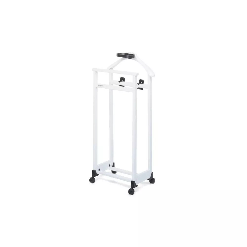 THE CLOTHES HANGER - FOPPA PEDRETTI Solid wood clothes hanger with a transparent coating, equipped with a shoulder for jackets and shirts, a pants bar, a skirt clip, a shoe base, and an accessory tray. Easily movable with four swivel wheels. Dimensions in cm: (height, depth, width) 103 x 27 x 46 cm