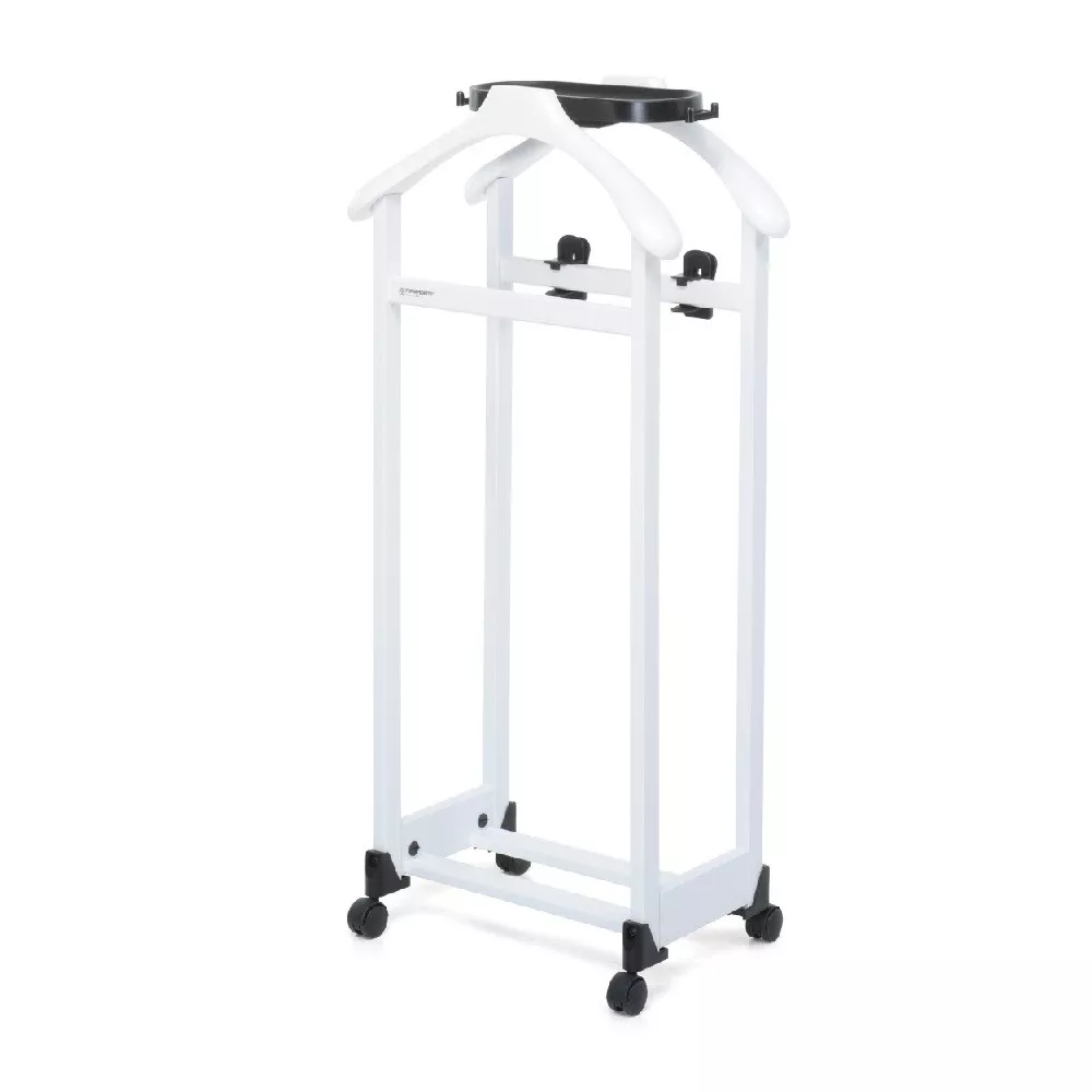 CLOTHES HANGER, IL METTINSIEME - FOPPA PEDRETTI Bedroom clothes stand with two shoulders. Solid wood structure. Equipped with an accessory tray and skirt hangers. The shoe base has swivel wheels. Dimensions in cm: (Height, Depth, Length) H 103 x D 27 x L 46 cm