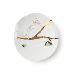 Kintsugi Japanese art assumes contemporary shapes. The delicate porcelaine is glorified and enriched with gold fragments for a tableweare collection made of charming and unexpected compositions. Sku: 09642 Coffee Cup with saucer Design: Marcantonio Material: Porcelain, Gold Size: cm ø 6,4 h. 5 Saucer: ø cm 11,4 h. 1,5 Dishwasher safe Discover The Collection: Kintsugi by Seletti