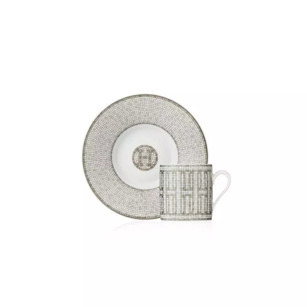 Hermes Mosaique au 24 Platinium Coffee cup & saucer In homage to the mosaic which covers the floor of 24 Faubourg Saint-Honoré, the historic Hermès store, the geometric friezes in matte grey tones, enhanced with platinum, play with the light. Capacity: 10 cl Code: 35017P For all Hermès products that are not available at the time of purchase, please consider a delivery time of 6 to over 12 months