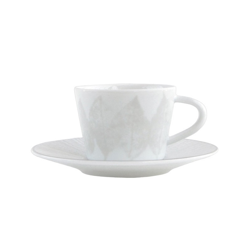 COFFEE CUP WITH SAUCER SILVA 1853 / 947 - BERNARDAUD The name of this pattern comes from the Latinum “silva”, a poetical evocation of trees, masters of the forest. It also invites us to look closer and admire the beauty of Nature: delicate leaf veins and lace-like plant fibers ornate the rim of plates, alternatively in white on white or platinum relief. Sku: 0185379 Dimensions: 8 cl Material: Porcelain
