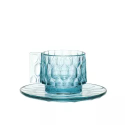 COFFEE CUP WITH SAUCER, JELLIES FAMILY 1582 - KARTELL This line of plates, trays, glasses, bowls, and carafes offers a wide selection of products made from brilliant, colored, and transparent PMMA. What makes this line unique is that each design features a different pattern inspired by nature and organic shapes, reminiscent of traditional molds used for making jellies in kitchens. These patterns highlight the temporality and variety that characterize each stage of the meal, from the initial course to the final one. The delicate, soft, and easily combinable transparent colors allow for setting vibrant tables, whether they be creative and original or more classic and monochromatic. Material COLORED PMMA IN MASS DISCOVER THE COLLECTION: Jellies Family Kartell