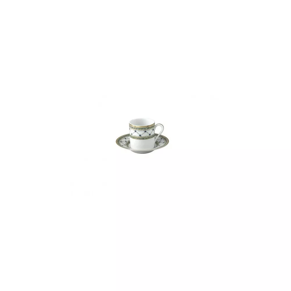 The “Allée du Roy” is one of Raynaud's classic collections, inspired by the French 18th century, which saw the creation of myriad china designs dedicated to the King and his court. A trellis entwined with leaves and cornflowers between crowns of laurels features on all pieces of the service in shades of blue and green. Material: Limoges Porcelain Coffee cup & saucer