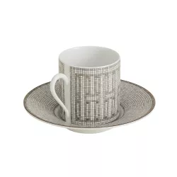 The Mosaique au 24 coffee cup and saucer by Hermès is a symbol of refinement and table artistry. Crafted in porcelain with screen printed and hand applied decorations, it is enhanced by gold or platinum cabochons that highlight the iconic geometric patterns of the collection.