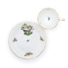 WARNING: THE ROTHSCHILD LINE BY HEREND, IS COMPOSED BY 12 DIFFERENT MOTIFS FOR PLATES AND CUPS. CONTACT US FOR MORE INFORMATION Rothschild Birds, one of the Best Known Herend pattern, takes its name from the important baronial Rothschild family. The RO main elements are two Bird with a Golden Necklace (there are twelve variants of the couple of birds). This pattern is ispired to a 19th century tale about Baroness Rothschild, who lost her pearl necklace in the garden of her viennese residence. Several days later it was found by her gardener, who saw some birds playing with it in a tree. Coffee cup with saucer, saucer cm 14 and cup h 7 cm Material: fine china with gold decorations Code: 707 Hand wash recommended. Never microwave an item with gold or platinum trim