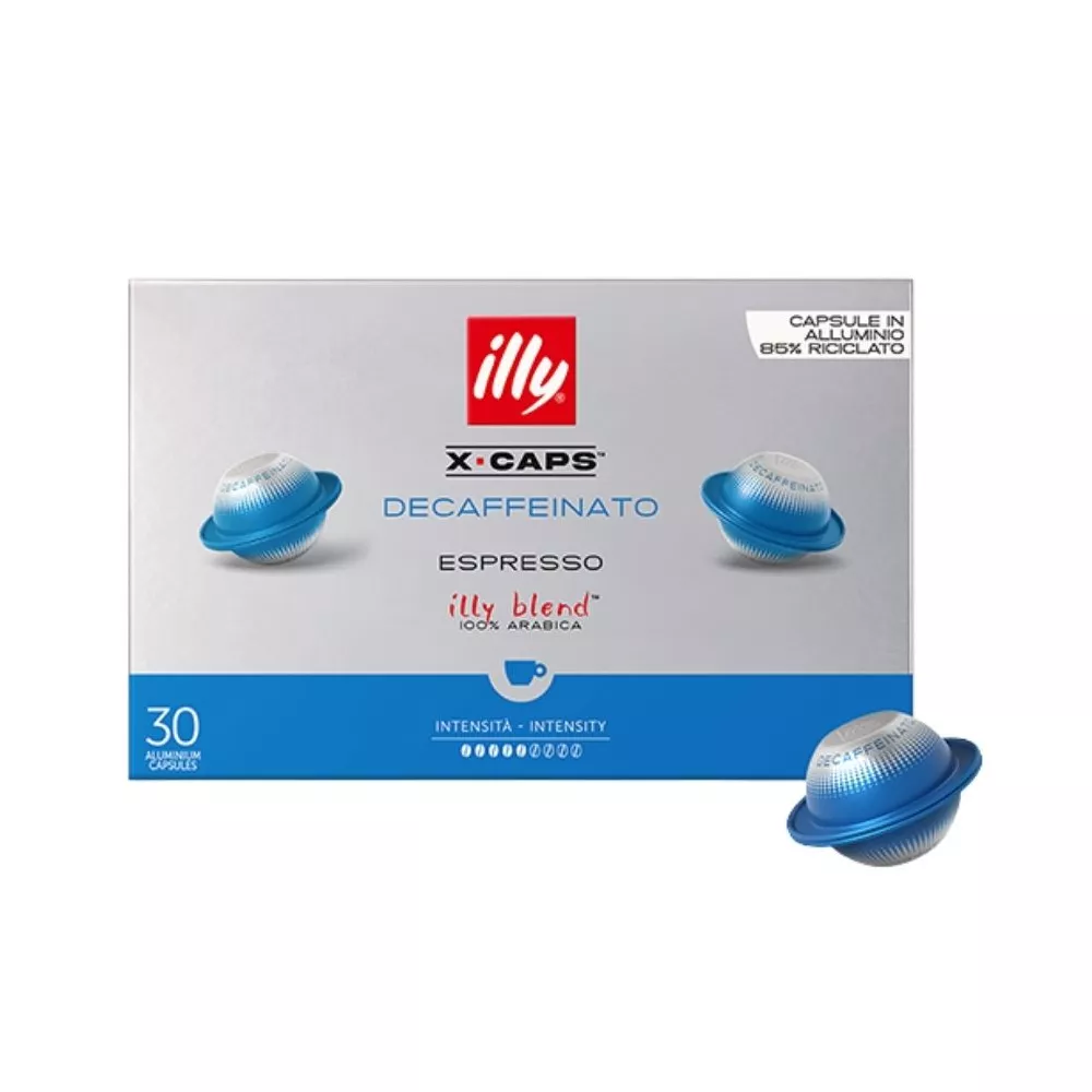 The X CAPS decaffeinated capsules deliver a balanced espresso with smooth notes of caramel, chocolate and toasted bread, finished with a naturally sweet aftertaste. Made of recycled aluminium, they preserve aroma and freshness while the hyperinfusion technology ensures rich body and dense crema. A refined choice for those seeking full aroma, balanced taste, creamy texture and the authentic Illy experience without caffeine.