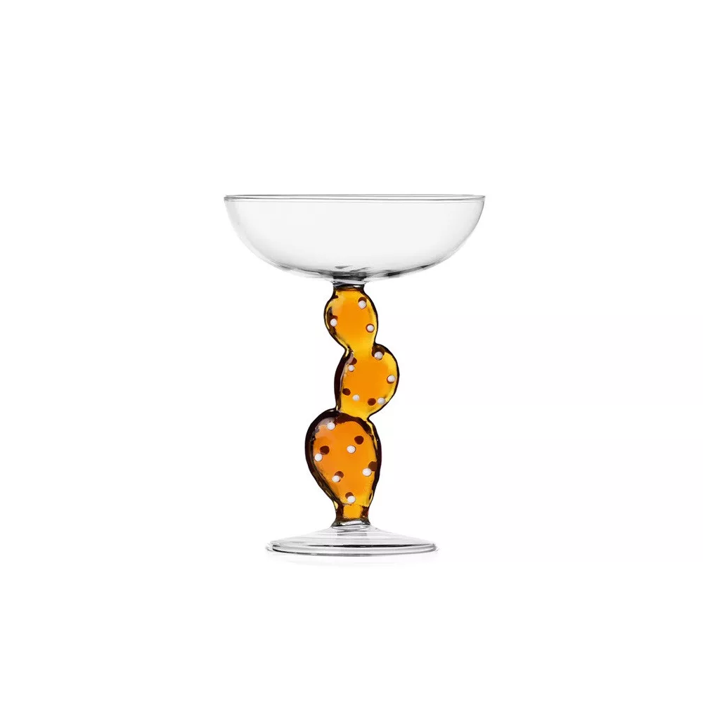 CHAMPAGNE GOBLET CACTUS, AMBER DESERT PLANTS, 09352331 - ICHENDORF MILANO The transparent glass champagne cup belonging to the Desert Plants collection, designed by the designer Alessandra Baldereschi, was produced by Ichendorf using blown borosilicate glass, which is resistant to hot liquids and dishwasher safe. Thanks to its special processing, it has a low thermal expansion that guarantees its durability and resistance to temperature changes. Ichendorf Milano, a leading glass manufacturer since 1920, is distinguished for producing high-quality products with modern and essential designs and durability. Dimensions: Ø 11,5 x H 16 cm Colour: clear / amber Material: borosilicate glass Washing instructions: Dishwasher safe with gentle cycle at 40°C.