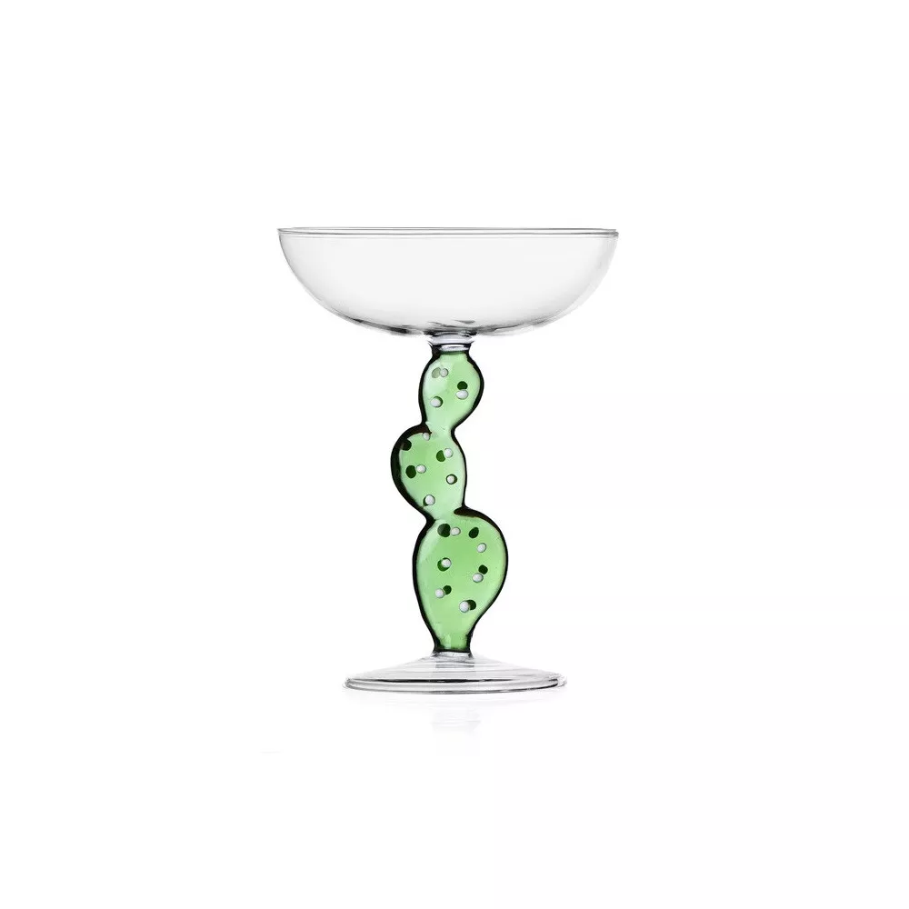 CACTUS CHAMPAGNE GOBLET, GREEN DESERT PLANTS, 09352334 - ICHENDORF MILANO The transparent glass champagne cup belonging to the Desert Plants collection, designed by the designer Alessandra Baldereschi, was produced by Ichendorf using blown borosilicate glass, which is resistant to hot liquids and dishwasher safe. Thanks to its special processing, it has a low thermal expansion that guarantees its durability and resistance to temperature changes. Ichendorf Milano, a leading glass manufacturer since 1920, is distinguished for producing high-quality products with modern and essential designs and durability. Dimensions: Ø 11,5 x H 16 cm Colour: clear / green Material: borosilicate glass Washing instructions: Dishwasher safe with gentle cycle at 40°C.