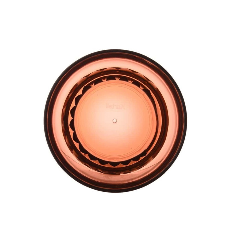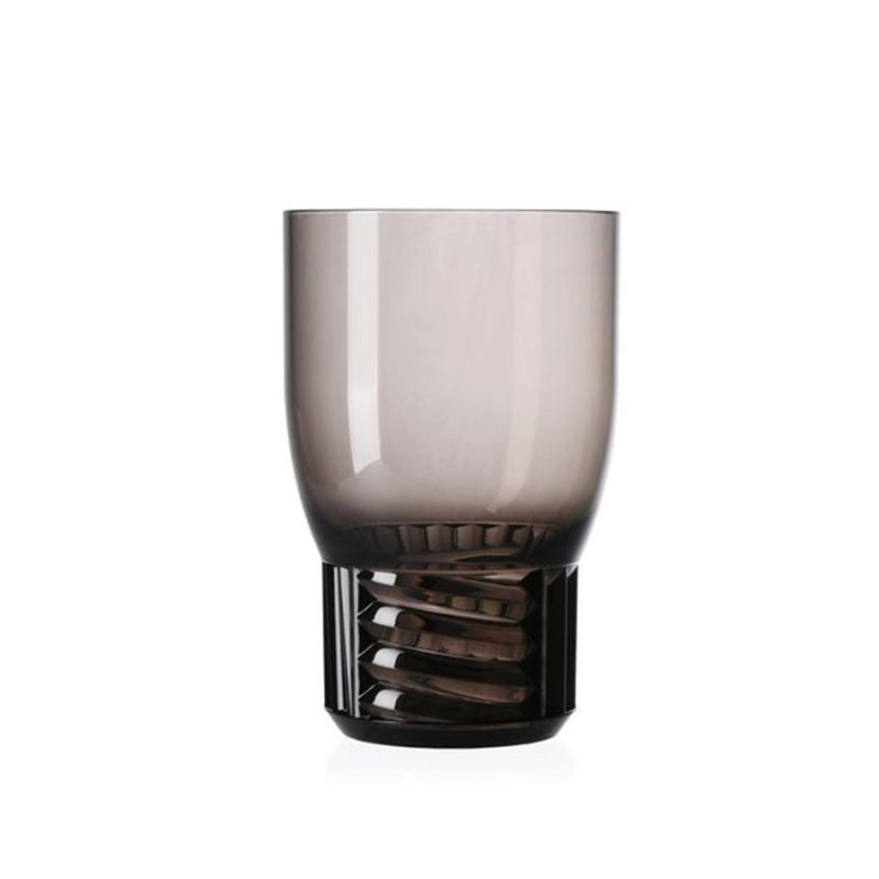 TRAMA WATER GLASS, 1513 - KARTELL The Trama tableware collection, created by Patricia Urquiola, offers a comprehensive range of dishes that draw inspiration from Japanese ceramics. These dishes exhibit intricate textures and feature natural colors reminiscent of opaque earth. Similar to rustic terracotta services found in country homes, the dishes possess a tactile roughness and are adorned with a graphic motif that gracefully captures the collection's essential essence. Material Transparent thermoplastic technopolymer dimensions Height: 13 cm Diameter: 8.5 cm Unit weight: 0.115 kg