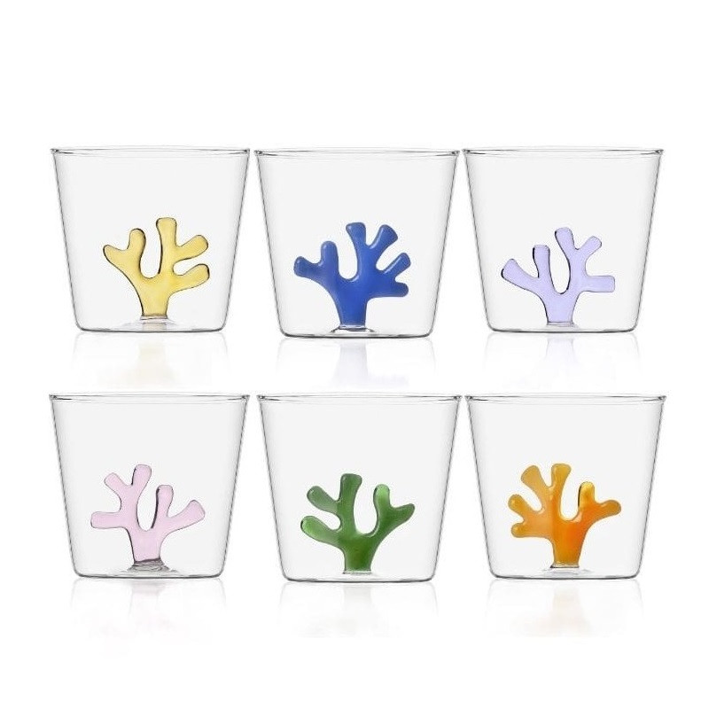 CORAL REEF GLASS, CORAL REEF - ICHENDORF MILANO Coral Reef, designed by designer Alessandra Baldereschi for Ichendorf, is a collection of glasses inspired by the marine world, creating a captivating and refined set. The coral tumbler, perfect for serving water and other beverages, features a small colorful coral branch positioned at the bottom of the glass. Material: Borosilicate Glass Size: H 8 x D 8.5 cm Reference: 09352048