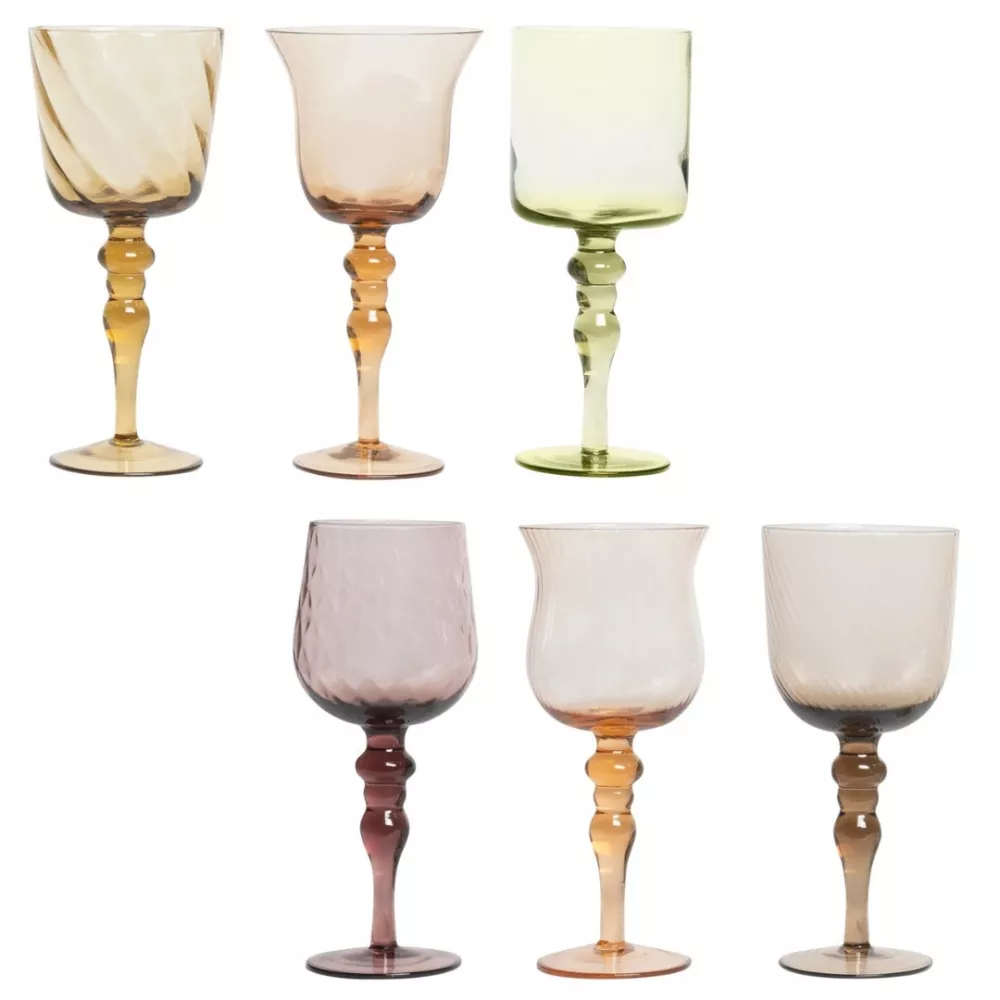 Set of 6 blown glass goblets in colored paste Suitable for dishwashers up to 250 washes Not suitable for microwaves Material: blown glass in colored paste Code: MCV2002 Dimensions: H 23,6 Cm